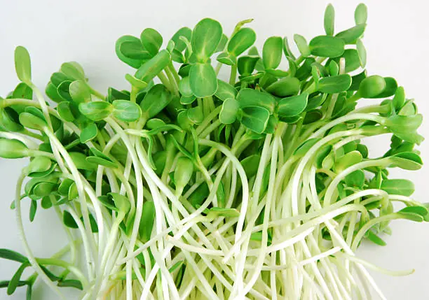 Sunflower sprouts are young germinated sunflower seeds harvested at an early stage, before full leaf development.